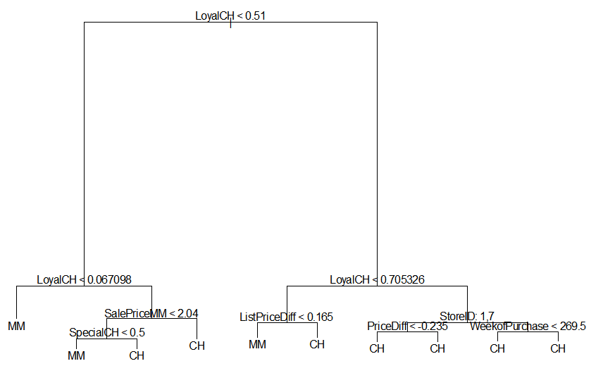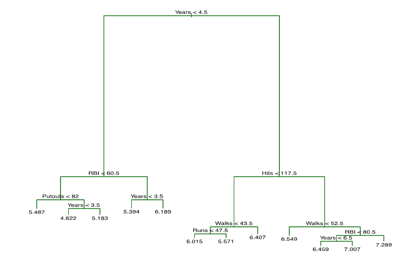 Cross-validation의 결과 트리는 여섯 개의 terminal nodes를 가집니다.