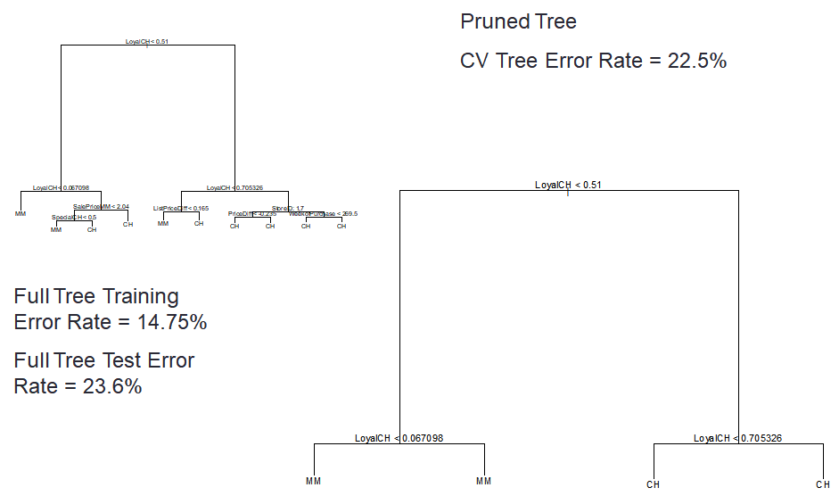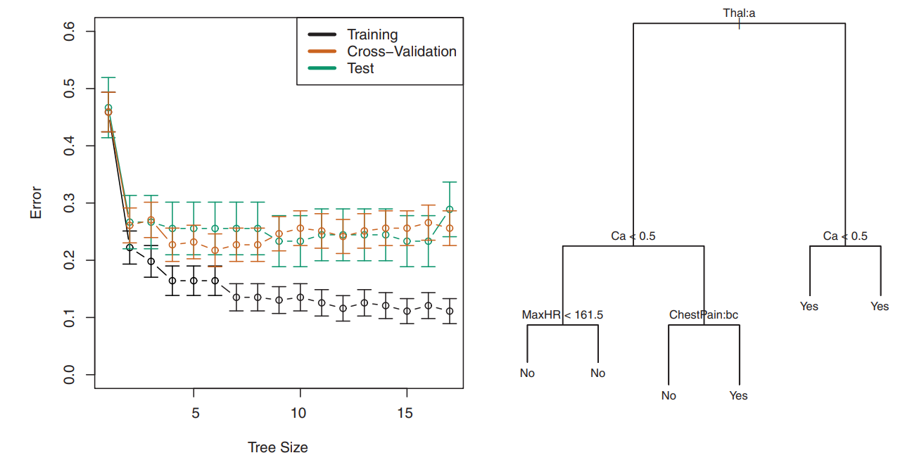 Right : 최소한의 cross-validation error가 나온 가지치기 된 트리의 결과입니다.