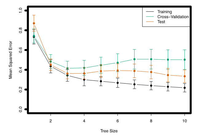 Cross Validation은 트리 사이즈가 3일 때(leaf nodes가 3일 때) 가장 작은 MSE를 나타냅니다.