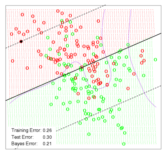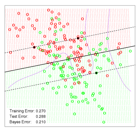 보라색 선은 Bayes decision boundaries를 나타냅니다.
