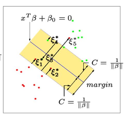 $\xi^{*}_{i}$는 점선으로 표시된 margin의 잘못된 쪽에 있는 i번째 포인트들의 양을 나타냅니다.