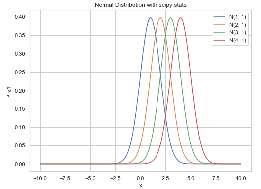 legend.append("N(" + str(mu) + ", " + str(var) + ")")