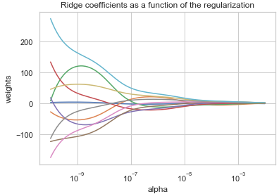 Plot Ridge coefficients as a function of the regularization — scikit-learn 0.21.3 documentation