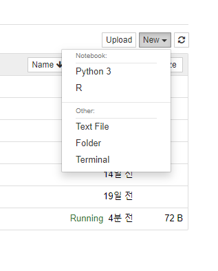 5. 우측 상단의 New클릭 후 Python 3아래 R 생성 확인