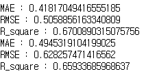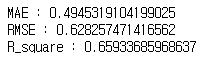 테스트 성능을 확인해보면 위와 같습니다. $R^{2}$ 값이 0.66인 것은 그리 좋은 결과는 아닙니다.