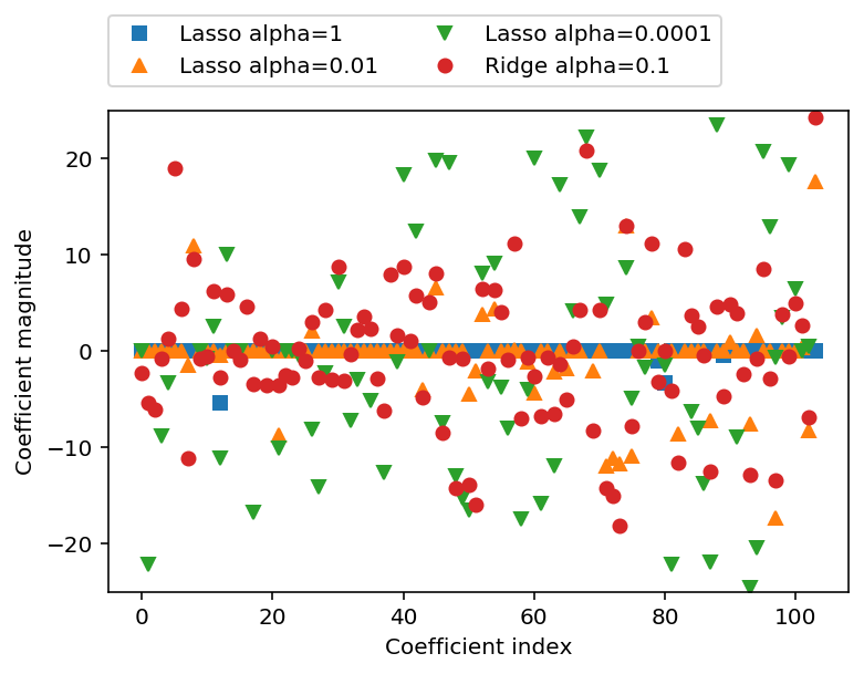 만약 $\alpha$가 매우 크면, 모든 파라미터는 결국 0과 매우 가깝게 됩니다. 결과로 평평한 선은 트레이닝 셋의 레이블의 평균을 통과하게 됩니다.