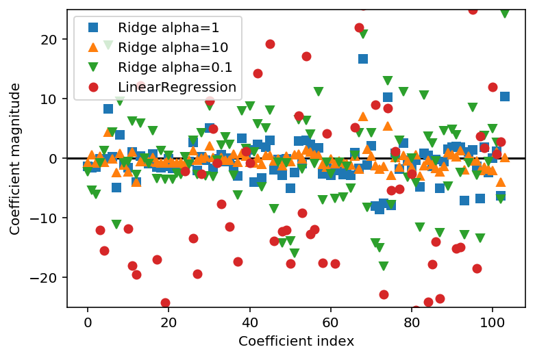 규제를 더하는 것은 (과대적합이 되지 않도록 모델을 강제로 제한하는 것) 훈련 데이터를 잘 예측하기 위해서 뿐만 아니라 모든 특성이 출력에 주는 영향을 최소한으로 만들어줍니다.
