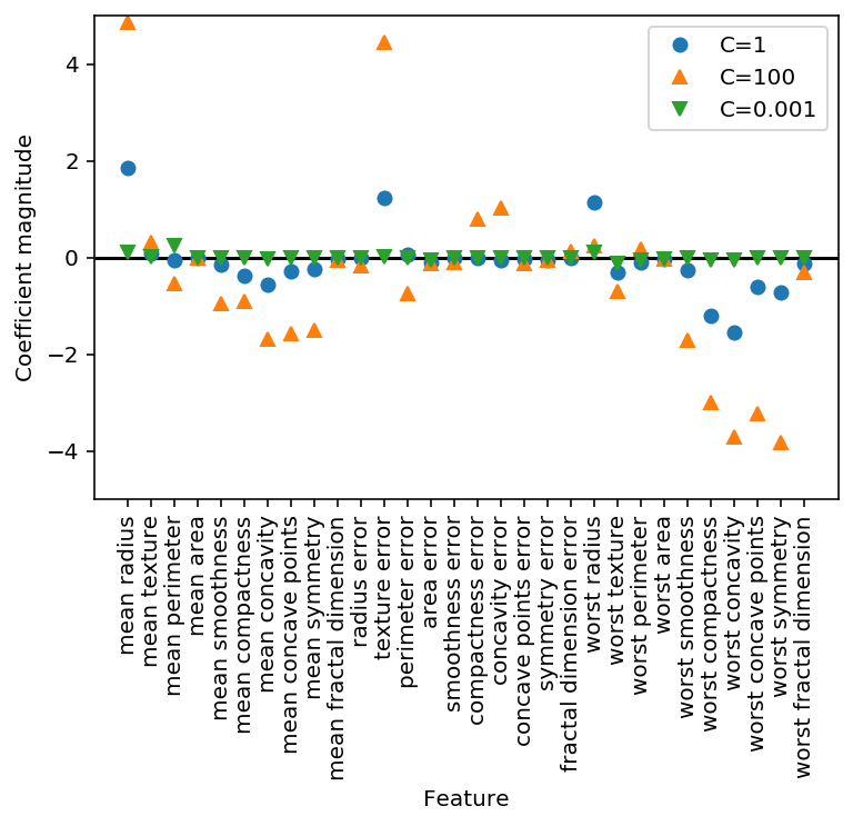 C 설정을 세 가지로 다르게 하여 학습시킨 모델의 계수는 위와 같습니다.