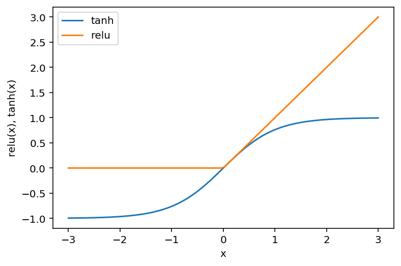 plt.ylabel("relu(x), tanh(x)")