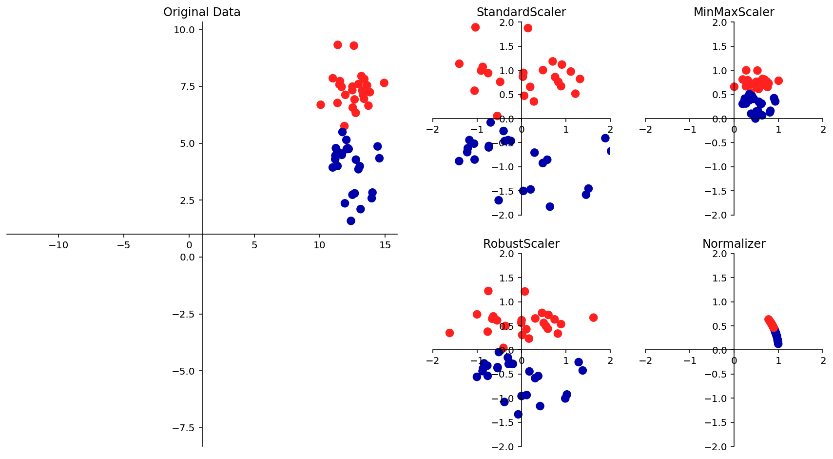 두 개의 특성을 인위적으로 만든 이진 분류 데이터셋의 전처리를 하는 여러 방법입니다.