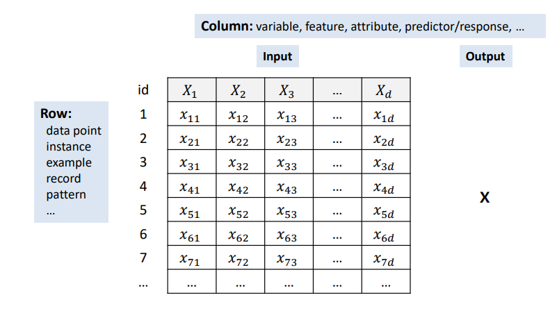 각 데이터 포인트 $\mathbf{x_{i}} \in R^{d}$는 d개의 특성 $\mathbf{x_{i}} = (x_{i}^{1}, ..., x_{i})^{d}$을 포함합니다.