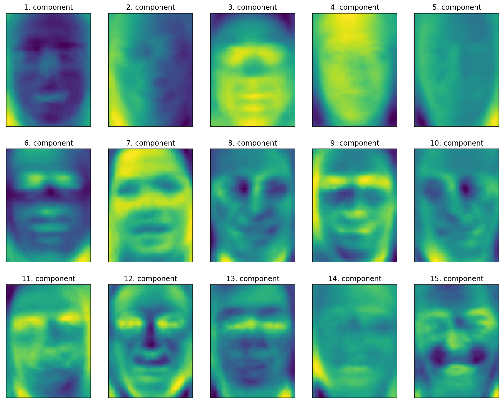 얼굴 데이터셋의 주성분 중 처음 15개입니다.