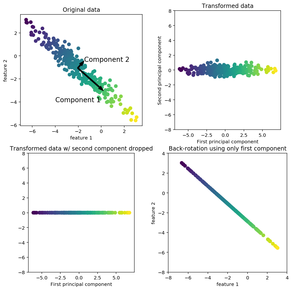 주성분 분석 (Principal component analysis (PCA))은 특성들이 통계적으로 상관관계가 없도록 데이터셋을 회전시키는 기술입니다.