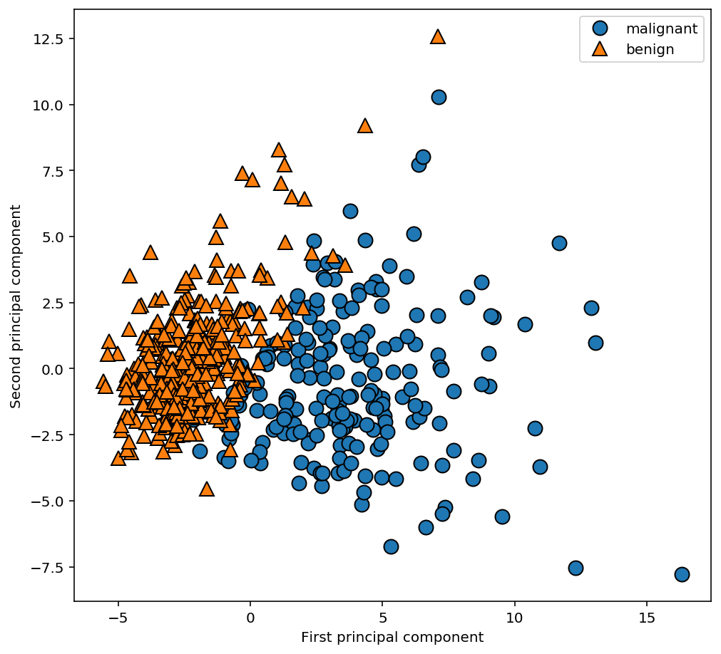 처음 두 개의 주성분을 사용해 그린 유방암 데이터셋의 산점도입니다.