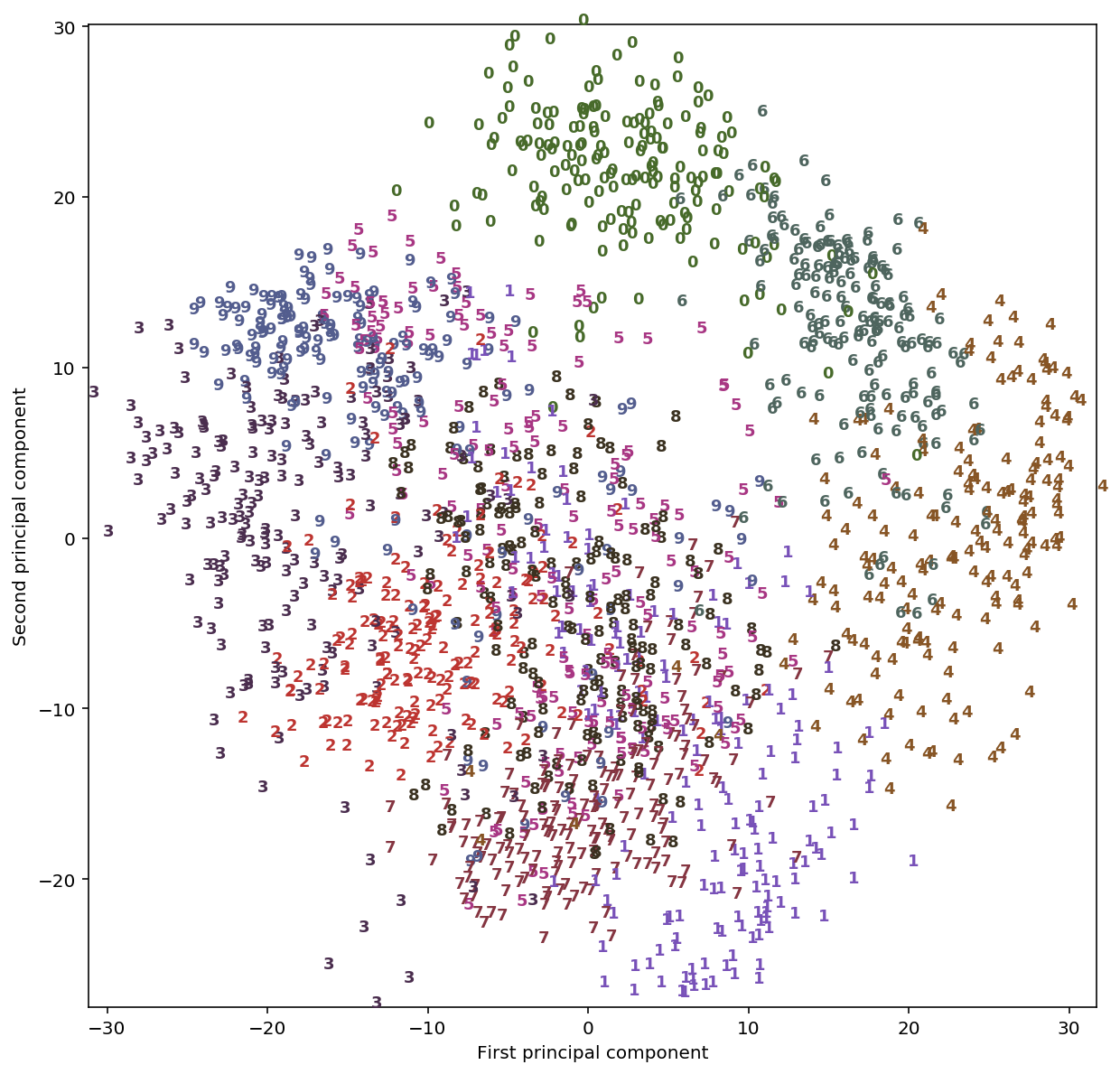 숫자 0, 6, 4는 두 개의 주성분만으로 비교적 잘 분리된 것 같습니다만, 아직 중첩된 부분이 있고