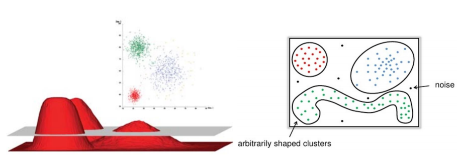 데이터의 밀집 지역이 한 클러스터를 구성하며 비교적 비어있는 지역을 경계로 다른 클러스터와 구분합니다.