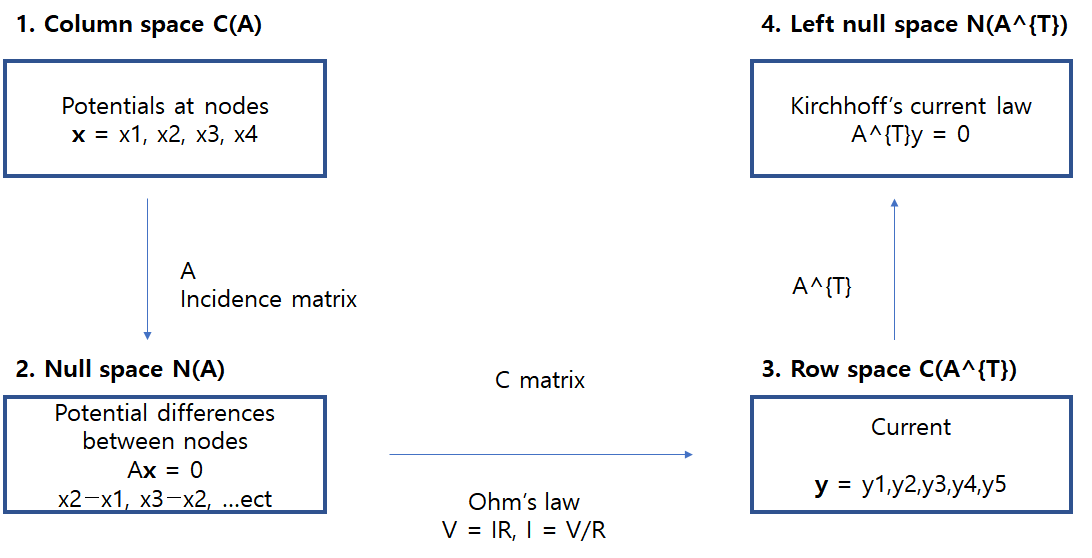 이전에 배웠던 4개의 주요 부분 공간이 전자회로의 그래프 모델에서 찾고자 하는 것과 일치합니다.