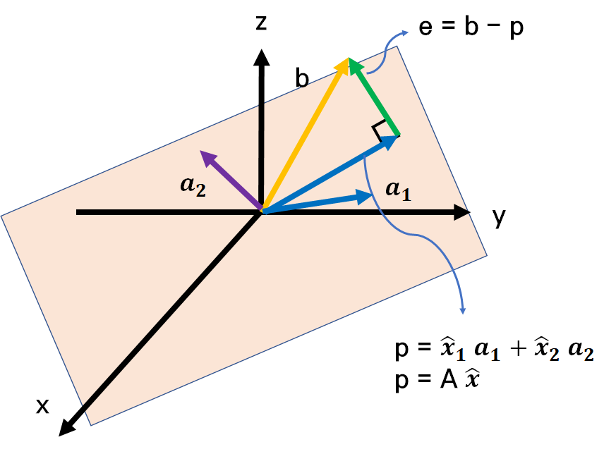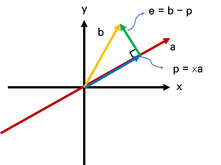 중요한 것은 벡터 b, e, p가 직각 삼각형을 이룹니다.