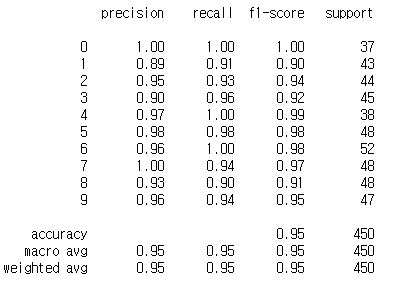 숫자 0에는 오차가 없으므로 클래스 0의 정밀도와 재현율은 모두 1로 완벽합니다.
