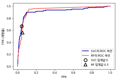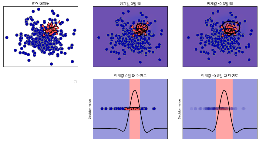 이진 탐색에서 decision_function은 0을, predict_proba는 0.5을 임계값으로 사용합니다.