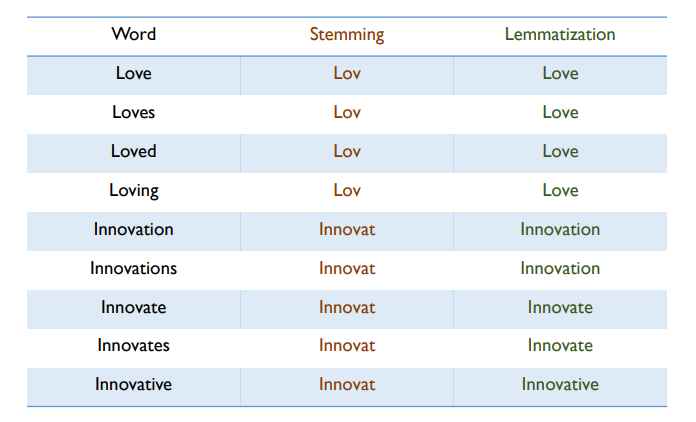 Stemming이 기본 형태를 찾는 거라면 Lemma는 단어들이 가지고 있는 품사를 보존하면서 단어의 원형을 찾는 것이 목적