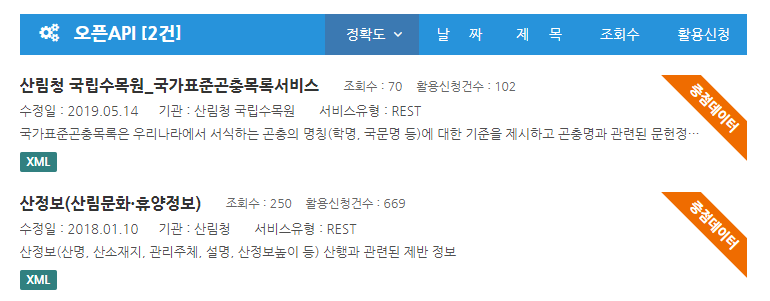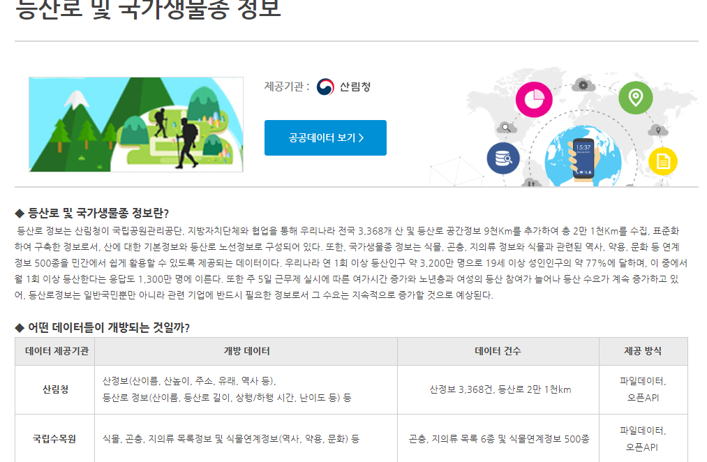공공데이터포털에서 우리나라 산에 대한 데이터를 얻고 싶다고 가정합니다.