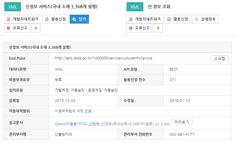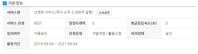 산정보 서비스(국내 소재 3,368개 설명)에서 활용신청을 클릭한 후 용도에 맞게 체크를 해주시면 됩니다.