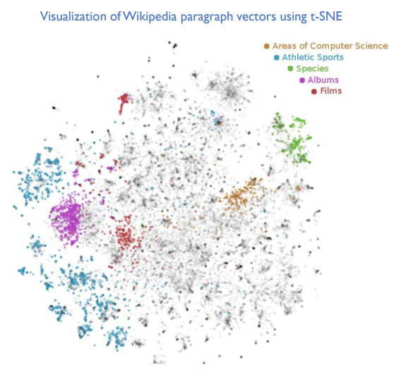 위의 그림은 각각의 문단들에 대해서 먼저 임배딩을 한 후에 t-SNE를 통해서 차원 축소를 한 후 보여준 그림