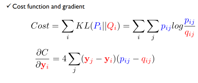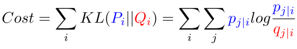 고차원에서 i번째 객체 이웃들을 선택할 확률 분포와 저차원에서 똑같은 아이에 대해서 이웃들이 섞이게 될 확률 분포를 완벽하게 일치 시키게 되면(i와 j 의 인덱스는 같음) 고차원에서 갖는 특징이 저차원에서 그대로 보존된다는 뜻