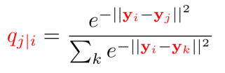 i하고 j라는 인덱스는 같은데 low dimension에서 $y_{j}$를 $y_{i}$의 이웃으로 정의할 확률은 다음과 같음