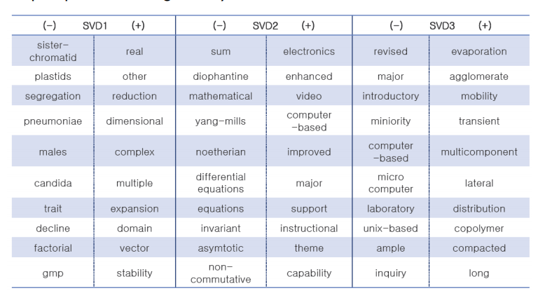 SVD의 값이 커지는 방향으로 단어의 영향력과 작아지는 방향으로 가는 단어의 영향력에 대해서 top ten 키워드를 보여줌