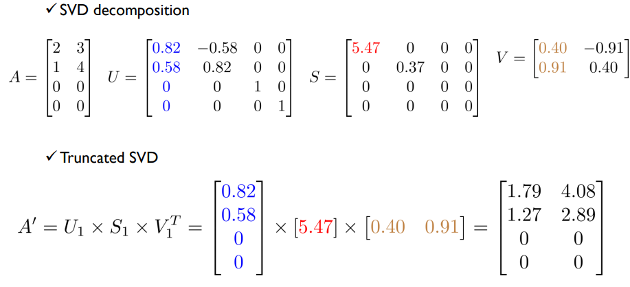 Truncated(Approximated) SVD: singular value가 내림차순으로 정렬되어 있으니 시그마 매트릭스에서 top k개의 가장 큰 singular value 보존함