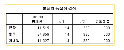 분산의 동질성 검정 결과 전화는 각 집단의 분산이 동일하다는 귀무가설이 기각되었습니다.