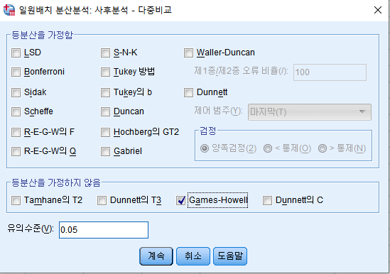 사후분석에서 등분산 가정과 가정하지 않을 때의 방법론을 체크해 두면 훨씬 편합니다.