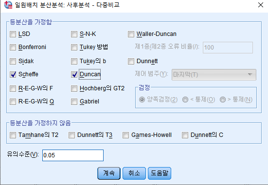 사후분석 창이 뜨면 Scheffe와 Duncan을 체크하고 계속을 클릭합니다.