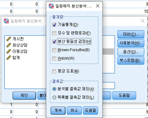 옵션에서는 기술통계 및 분산 동질성 검정에 체크를 했습니다.