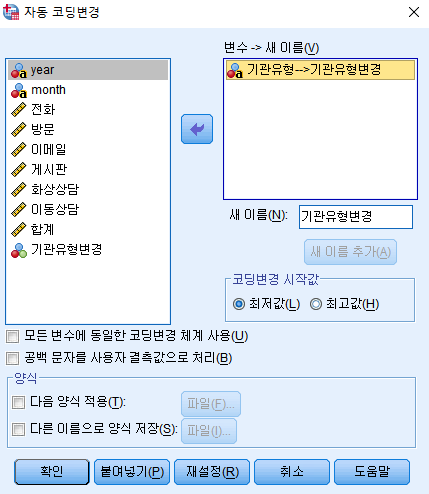 새로운 변수로 기관유형변경을 넣어주고 확인을 클릭합니다.