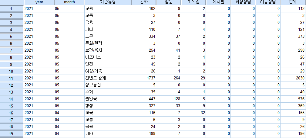 데이터는 위와 같습니다. 변수로 년월, 기관유형, 전화, 방문, 이메일, 게시판, 화상상담, 이동상담, 합계가 있습니다.
