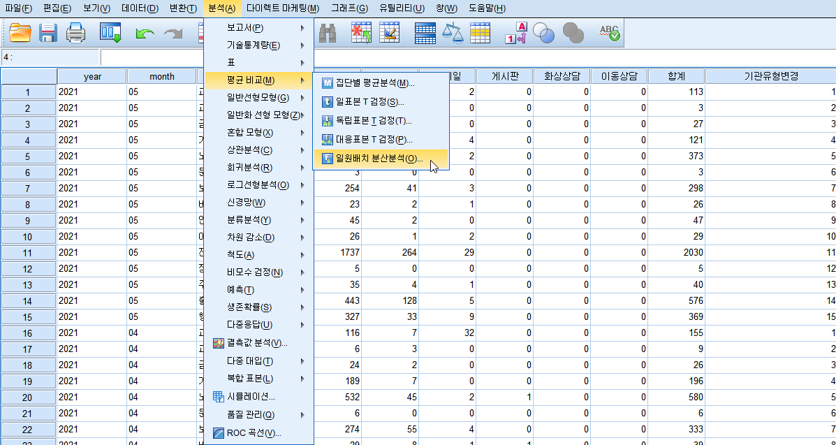 메뉴 평균 비교 > 일원배치 분산분석을 클릭합니다.