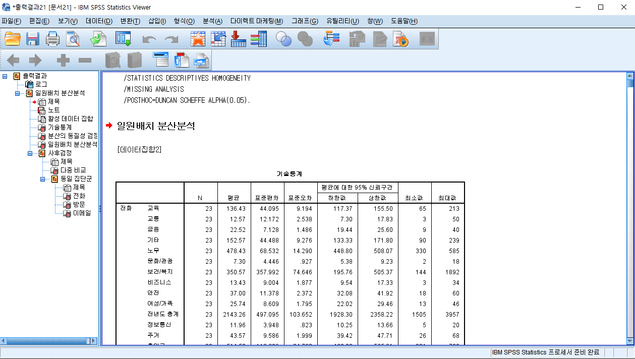 일원배치 분산분석에 대한 출력결과가 뜹니다.