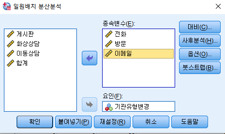 기관유형은 범주형 변수이고 전화, 방문, 이메일은 연속형 변수이므로 분산분석(ANOVA)를 이용해 분석해 보겠습니다.