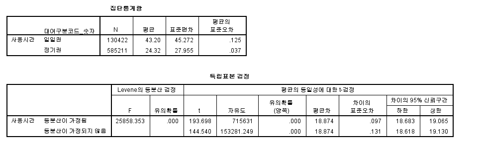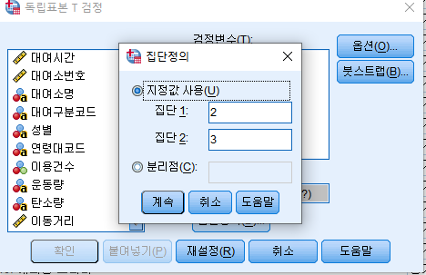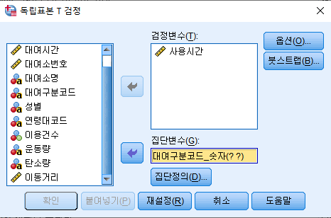 검정변수 칸에는 종속변수인 사용시간을 집단변수 칸에는 독립변수인 대여구분코드_숫자를 넣어줍니다.