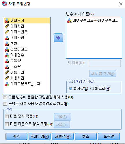 문자 그대로를 분석에서 사용할 수 없기에 자동 코딩변경을 통해 대여구분코드_숫자라는 변수를 새로 추가했습니다.