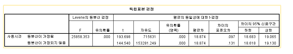 실제 두 집단의 평균 차이가 통계적으로 유의한지 보기 위해서 독립표본 검정 표를 보겠습니다.