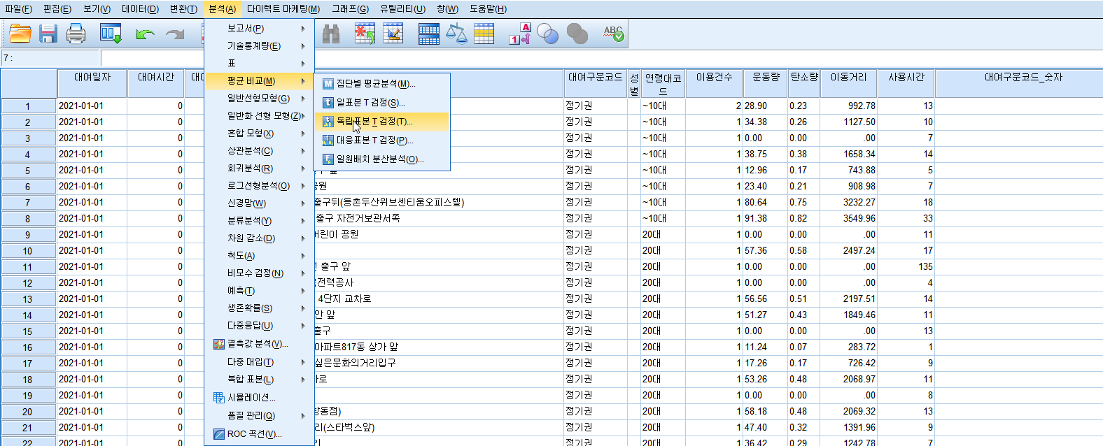오늘은 공공자전거 이용정보(시간대별) 2021년 1월 데이터를 가지고 독립표본 T검정을 해보겠습니다.