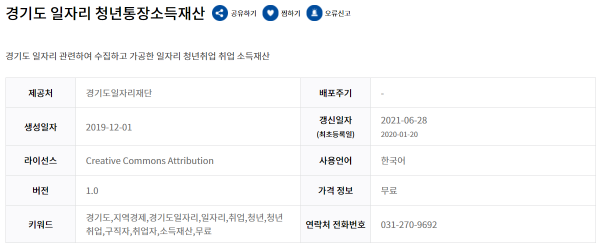 데이터는 경기지역경제포털에서 제공하는 경기도 일자리 청년통장소득재산입니다.