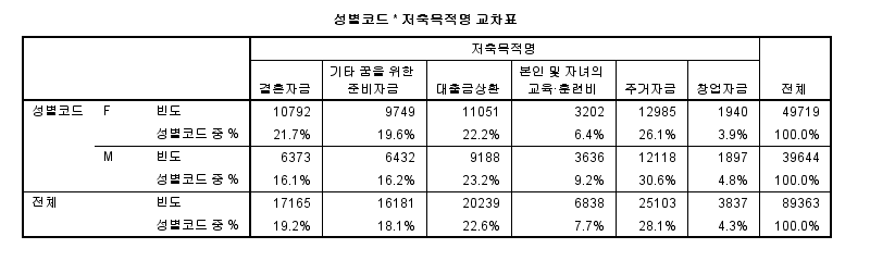귀무가설 : 성별과 저축목적은 관계가 없을 것이다. 즉, 남녀별 저축목적 차이는 없다.