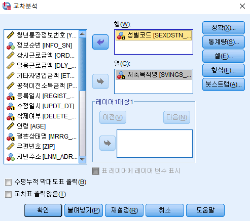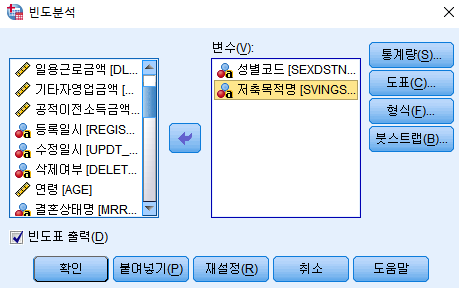 변수에 성별코드, 저축목적명을 넣고 확인을 클릭합니다.