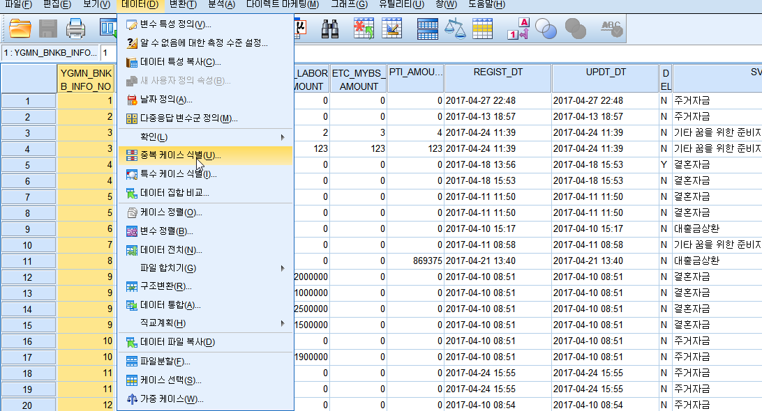 메뉴에서 데이터 > 중복 케이스 식별을 클릭합니다.