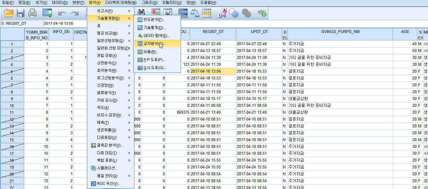 메뉴에서 분석 > 기술통계량 > 교차분석을 클릭합니다.